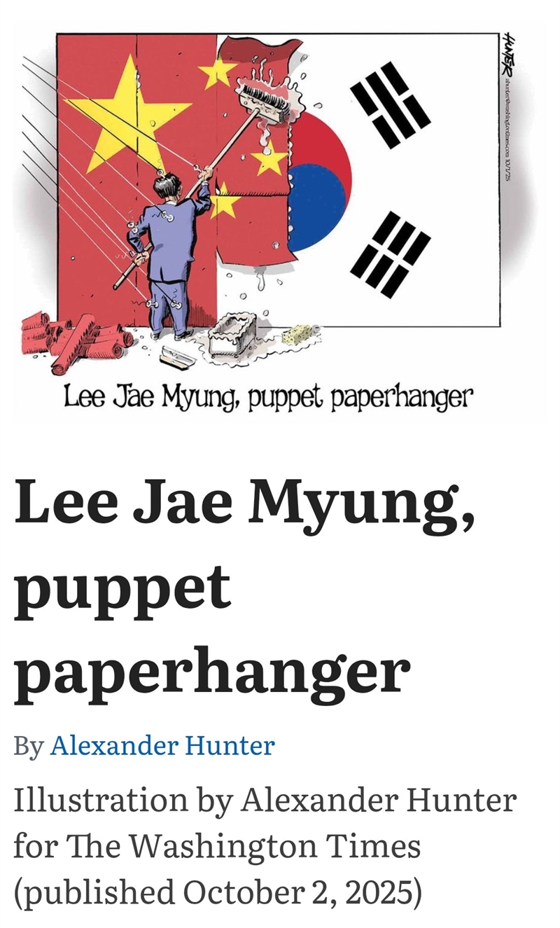 미국의 워싱턴 타임즈가 최근 이재명을 china의 꼭두각시로 묘사하는 일러스트를 게제했다. 해당 삽화에는 태극기를 지우고 중공기를 덮어씌워 그림을 그는 남성이 묘사되고 자막에는 "이재명..꼭드각시"라고 노출시키고 있다. 0 0 방송언론소비자주권연대 이건희 기자 core7949@gmail.com 이건희 기자의 기사 더보기 저작권자 ⓒ 방송언론소비자주권연대, 무단 전재 및 재배포 금지
