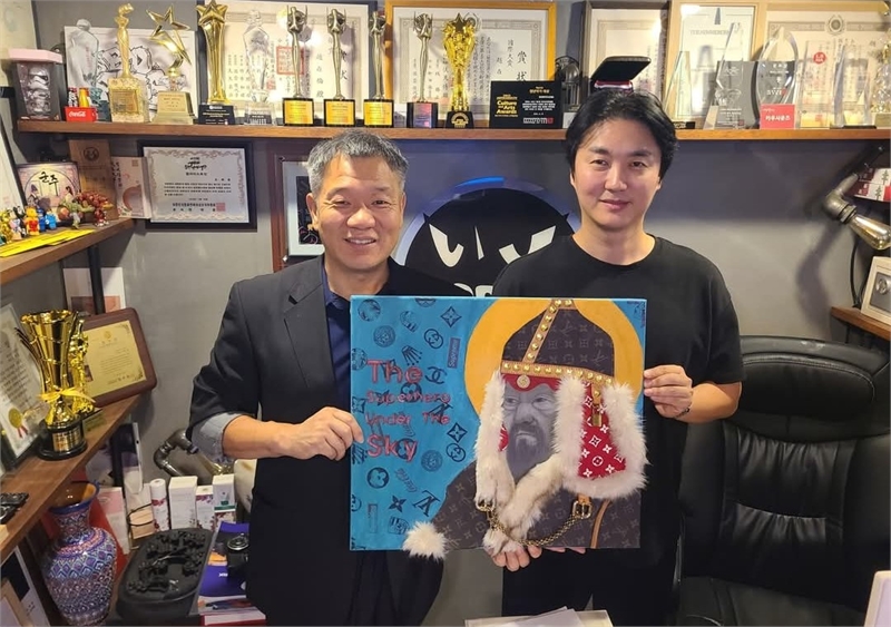 본지 이건기자 와 작가 배드보스가 연남동작업실에서 새로공개된 이순신장군 초상을 들어 보이고 있다.