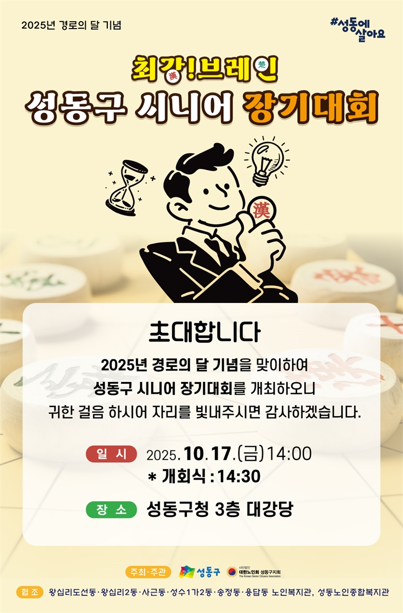 2025년 10월 17일 금요일, 14:00시 서울 성동구청(구청장 정원오)과 대한노인회 성동구지회가 주최한 시니어 장기대회가 성황리에 개최되었다.