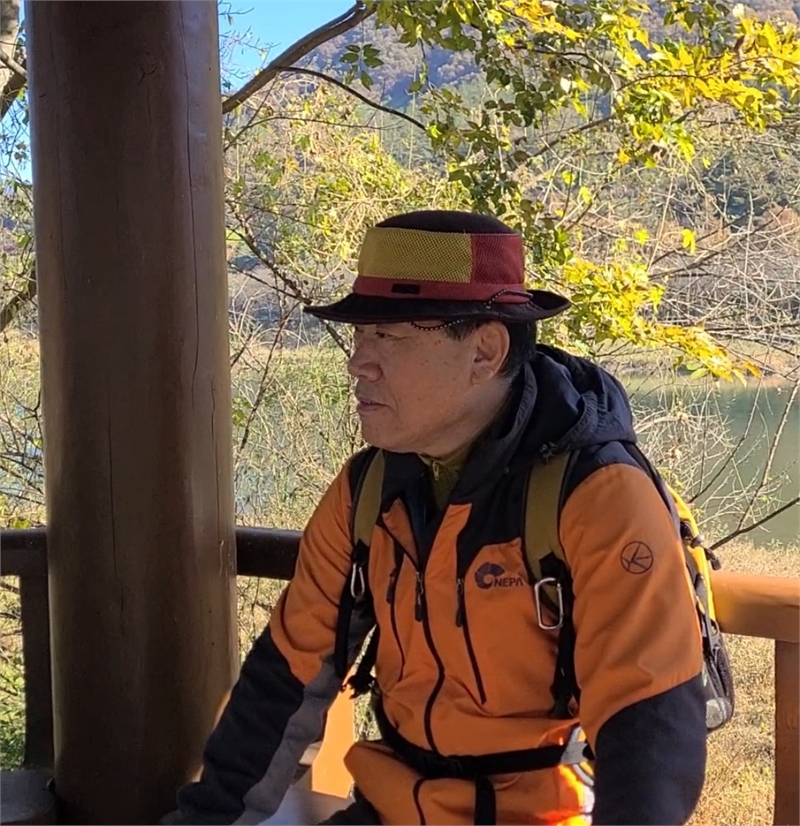 김성규 회장이 섬진강변 정자에 앉아 이순신장군의 한산섬 시조를 읇고 있다.